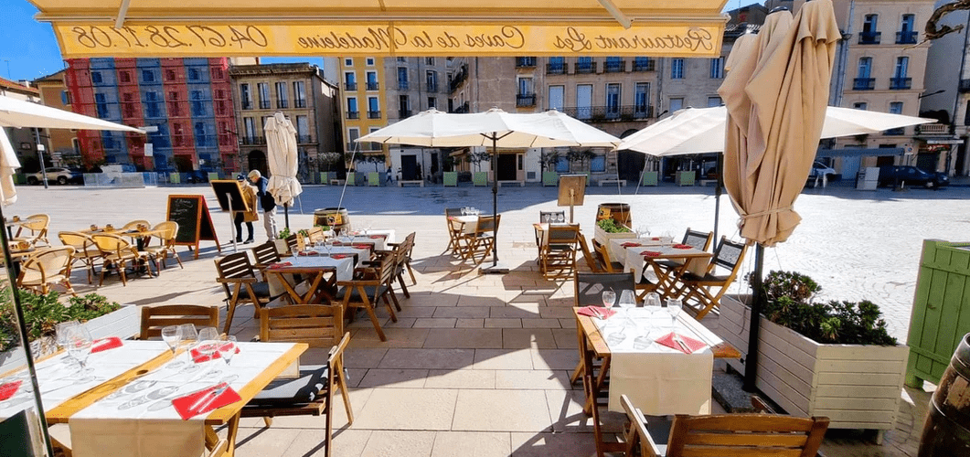 La terrasse est sur la place historique de la Madeleine et la salle en bas dans les caves voutées.